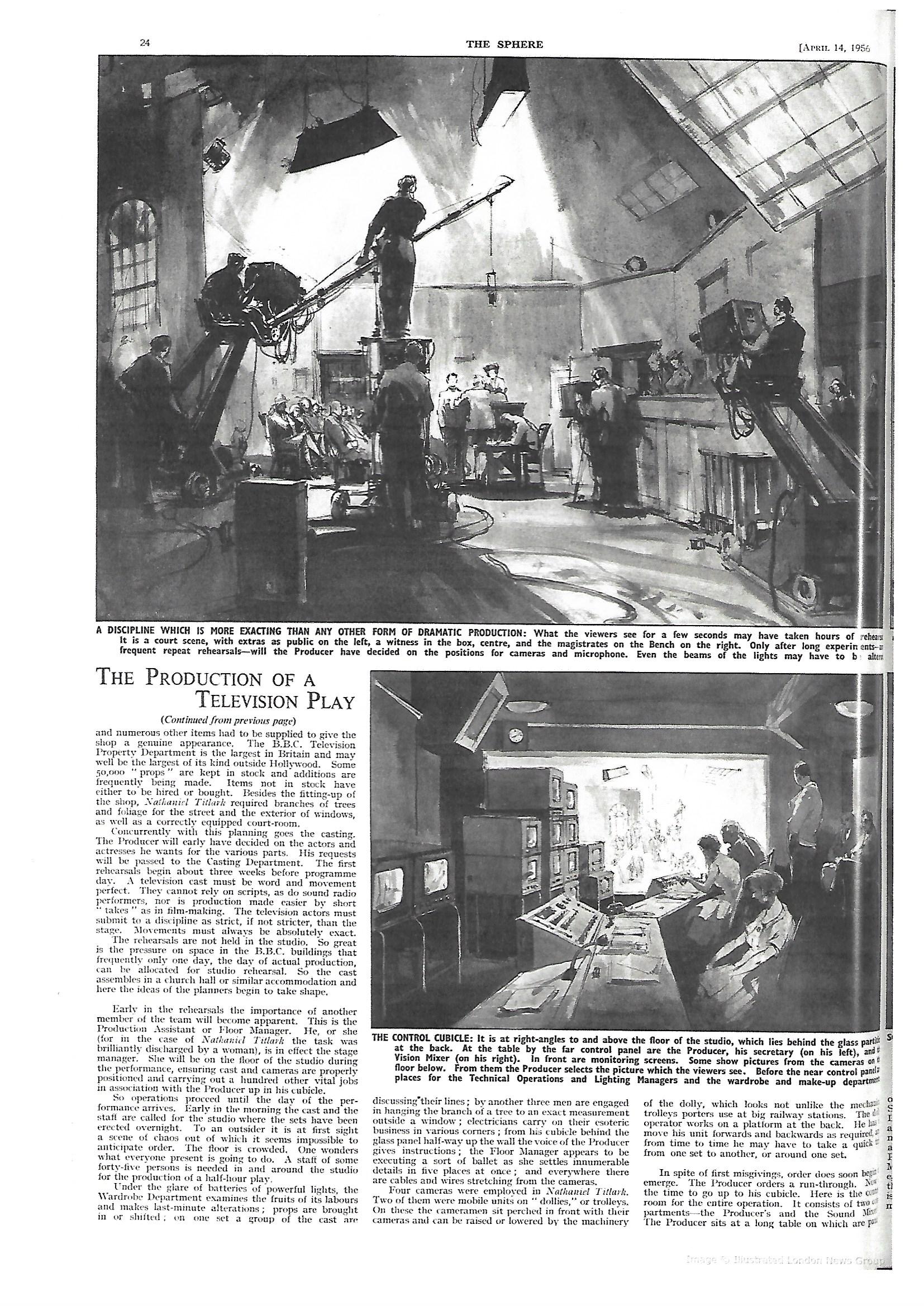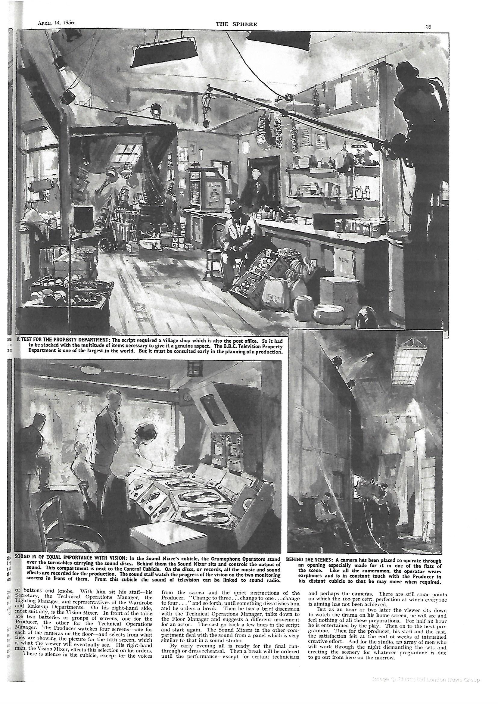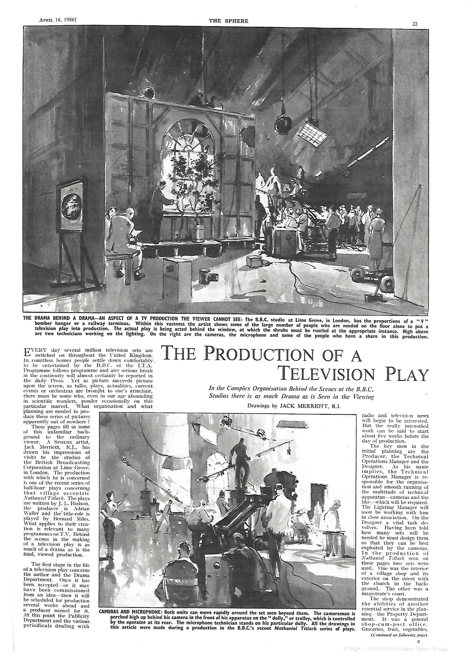 A fuller description of the production process, with illustrations of the studio and the sets is in the article itself, which is included with this note*. It was originally published in The Sphere of April 14th 1956. The pictures which are sketches are by Jack Merriott, R.I. who was a regular contributor to The Sphere, but is perhaps better known as one of the great illustrators of transport posters for British Rail.